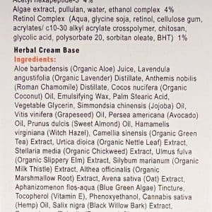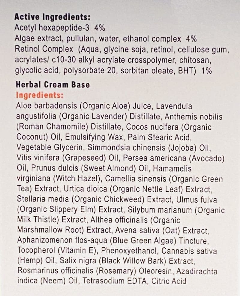 Provide therapeutic doses of 1% Retinol complex, 4% Acetyl Hexapeptide and 4% hyaluronic acid in an all-natural herb blend of oils and extracts.