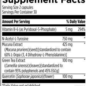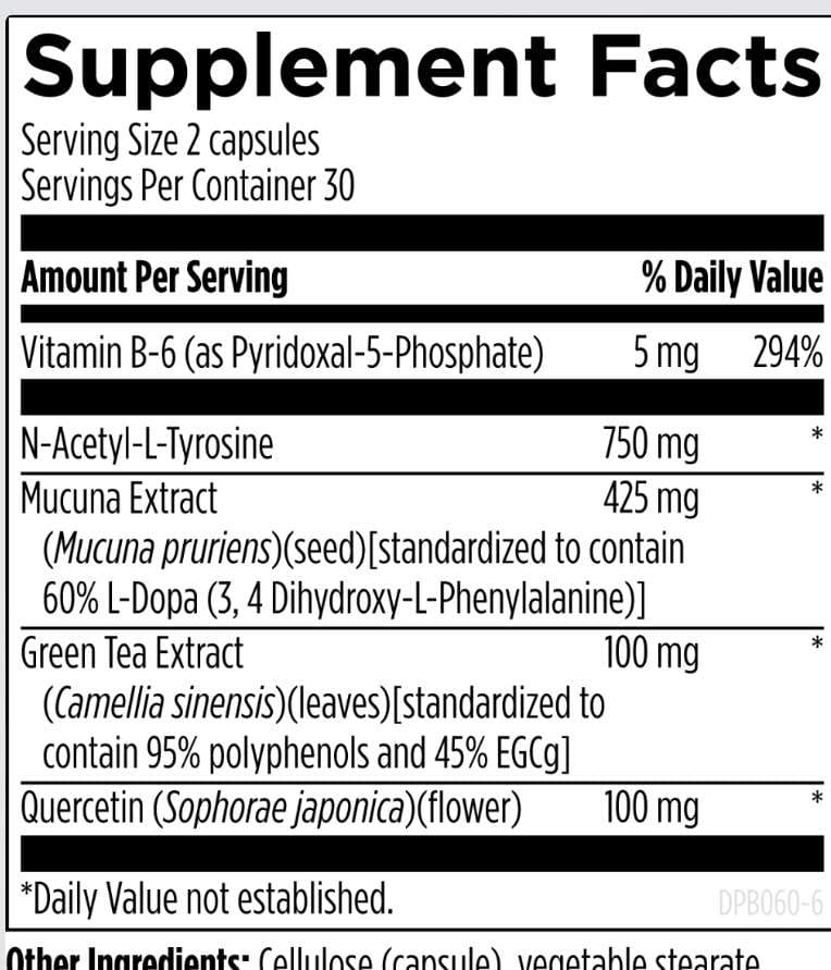 Designed to support the body’s natural production of dopamine, one of the body’s primary catecholamines. Dopamine is essential for the normal functioning of the central nervous system, and it is associated with attention, learning, movement, balance, and mood regulation.* The primary ingredient in is Mucuna pruriens, a botanical that naturally contains L-Dopa, the metabolic precursor to dopamine, which can cross the blood-brain barrier. Additional ingredients include epigallocatechin gallate (EGCg), acetyl-L-tyrosine, quercetin, and vitamin B6, all selected for their synergistic roles in the production and regulation of dopamine.*