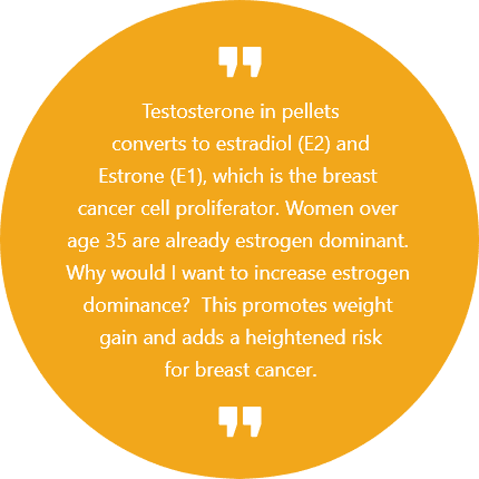 For me, personally, pellets for women simply don’t make sense. All that testosterone being implanted continuously has to go somewhere. Women aren’t meant to metabolize all that testosterone. And when it converts to estrogen, it is problematic. Women over the age of 35 are already estrogen dominant. Why? Because we begin to lose our progesterone (that balances out our estrogen) around age 35. Remember these 5 words: Estrogen is a FAT STORER. So when all that testosterone in the pellet begins to convert to estrogen, this is the weight gain piece. So why would I want to put even more estrogen into my already estrogen dominant body? Even more importantly is the whole estrone piece. Why would I want to increase my risk of breast cancer with the testosterone pellet converting to estrone, which, again is the breast cancer cell proliferator? Estrogen dominant women already have a heightened risk for breast cancer. So for me, to put anything in my body on purpose, that could heighten this risk for breast cancer just doesn’t make sense.
